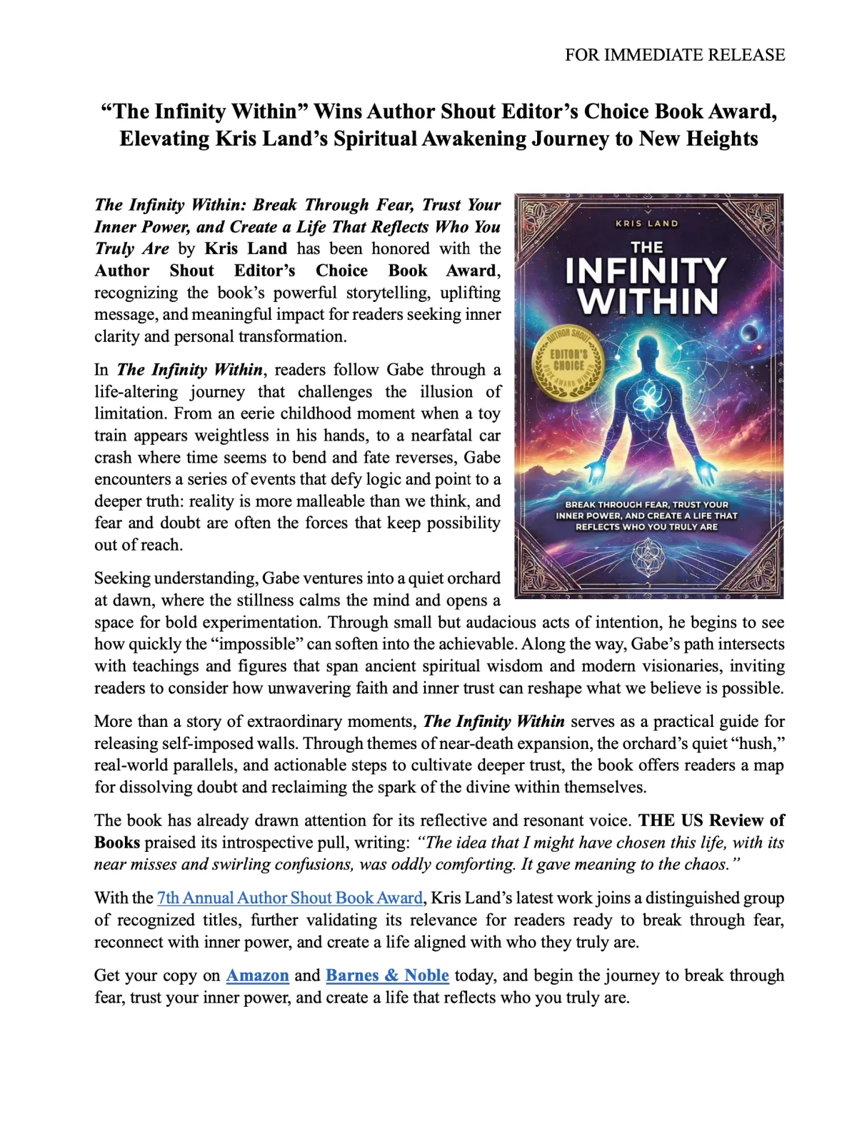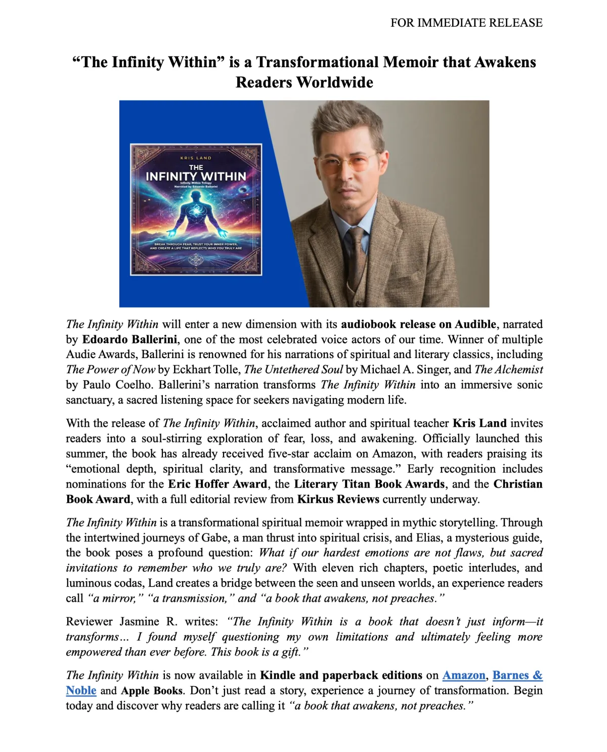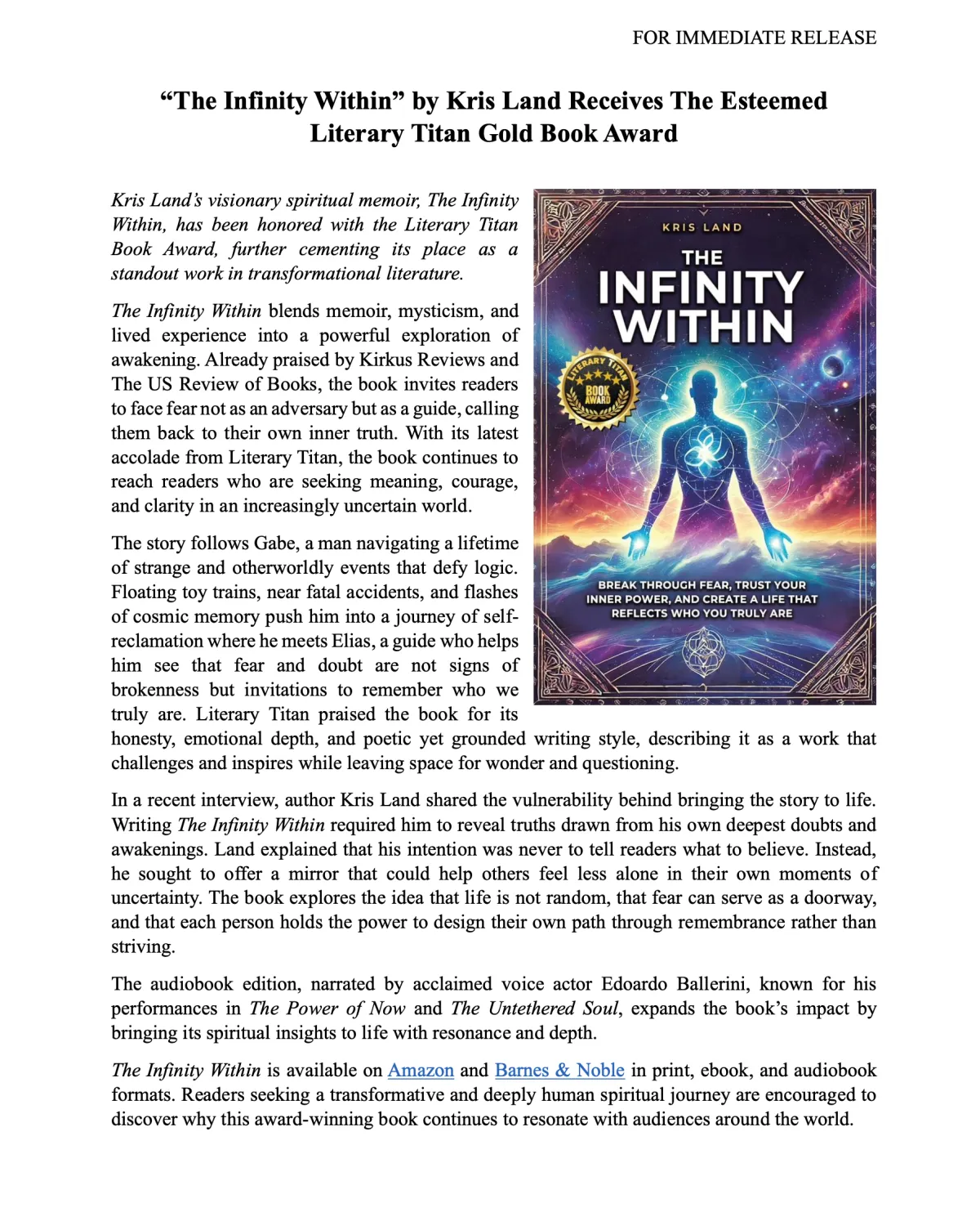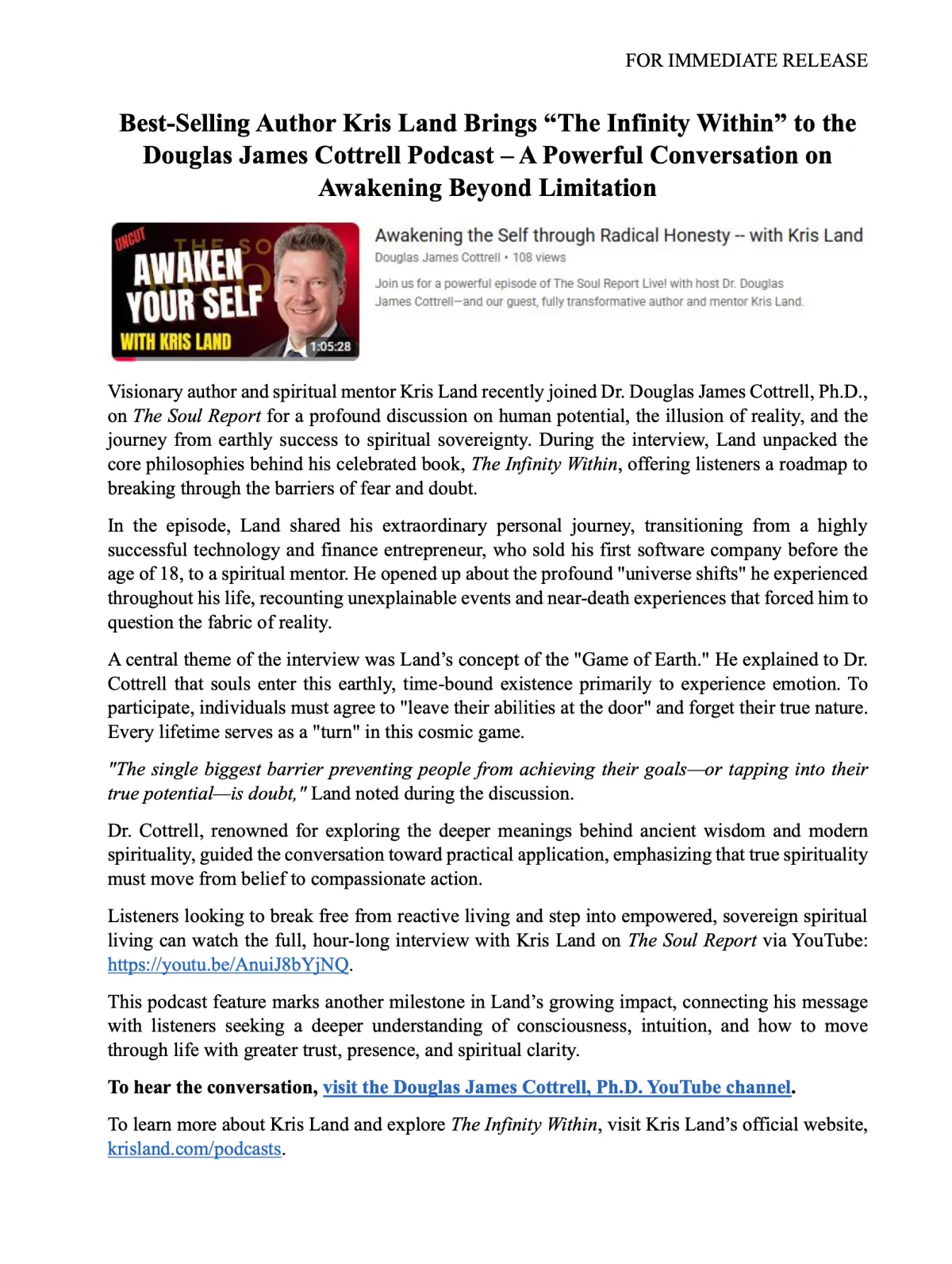 This media hub brings together Kris Land’s podcast interviews, editorial reviews, book awards, press mentions, and official announcements in one accessible place. As the author of The Infinity Within Trilogy and a longtime entrepreneur, Kris shares perspectives on inner clarity, creative growth, leadership, and conscious living through long-form conversations and featured media. Explore this page to discover recent appearances, critical recognition, and key updates across his publishing and speaking work.